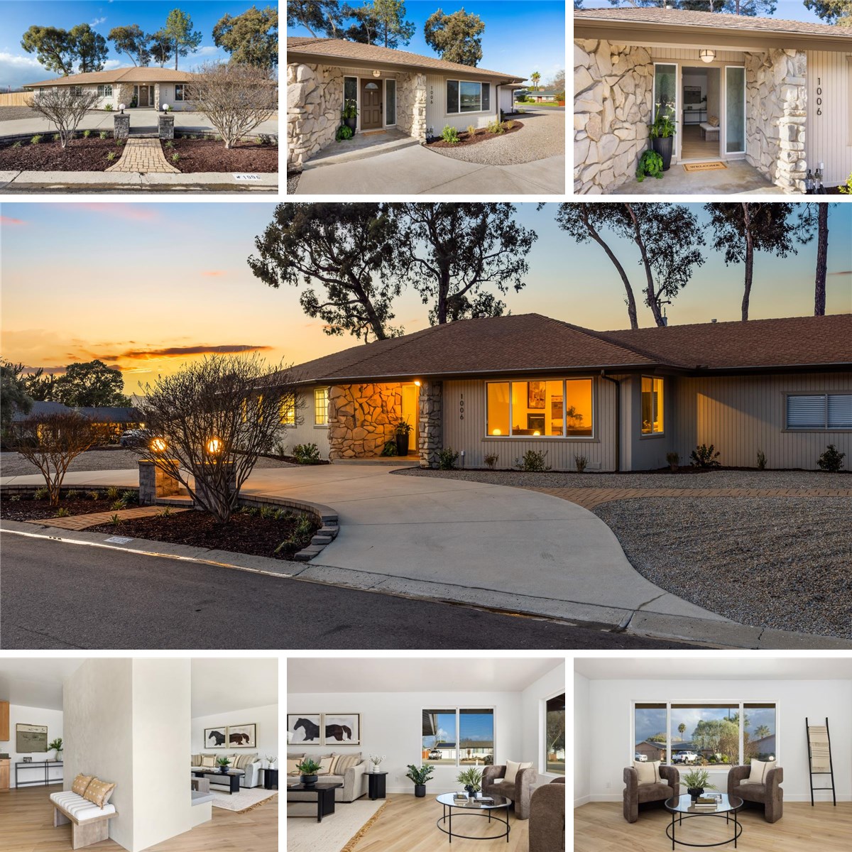 Located in Country Club Estates, one of Paso Robles’ most desirable neighborhoods, this 3 bedroom, 2 bathroom home reflects a clean, modern aesthetic with subtle mid-century influence. New luxury vinyl plank flooring runs throughout the ±1,776 sq. ft. floor plan. The living area is anchored by a Venetian plaster fireplace with an integrated bench, adding character and texture. Oversized windows and multiple sliding doors bring in abundant natural light and open to the backyard. The kitchen offers warm wood cabinetry, generous storage, and dual ovens, connecting comfortably to the dining area for everyday living and entertaining. Both bathrooms feature custom tile work and quartz-topped vanities. Situated on an expansive 17,000 sq. ft. corner lot, the property includes new fencing, an oversized concrete patio, and low-maintenance landscaping. Homes with this combination of design, lot size, and setting are seldom available in Country Club Estates.